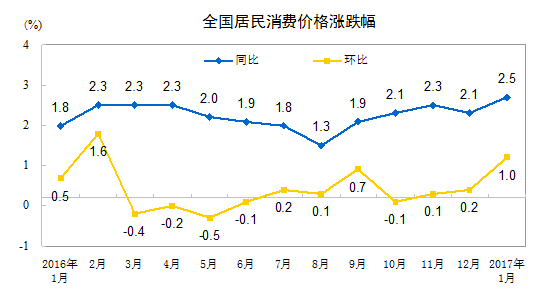 2017年1月份居民消費(fèi)價(jià)格同比上漲2.5%