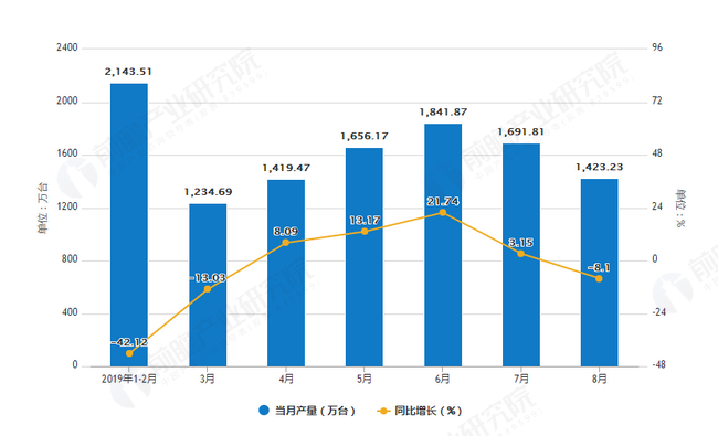 據國家統計局市場調研統計數據顯示,2019年1-2季度重慶市移動通信手持機產量有所增加,2019年7月重慶市手機產量為1691.81萬臺,同比增長3.15%。2019年1-8月重慶市移動通信手持機產量為11291.78...