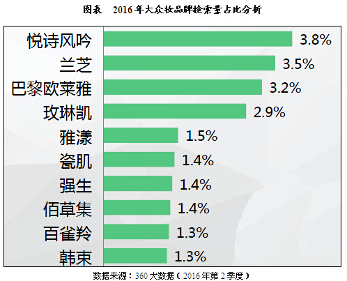 大眾品牌,品牌眾多關注度較分散,悅詩風吟、蘭芝和巴黎歐萊雅排名前三勢均力敵。