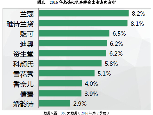 2016年,高端品牌,品牌數量少集中度高,Top10品牌檢索量占比近60.0%,其中雅詩蘭黛和蘭蔻排名前兩位,檢索量占比均在8.0%左右。