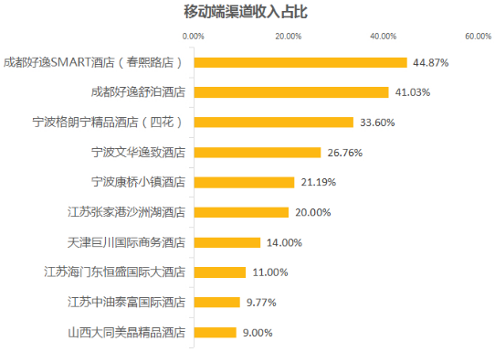 從數(shù)據(jù)上來看,上榜酒店的移動(dòng)端渠道收入占比依舊主要集中在10%—40%之間。很多酒店不愿在酒店移動(dòng)互聯(lián)網(wǎng)直銷化精力而寧愿與OTA渠道合作,主要原因是不知道互聯(lián)網(wǎng)直銷為酒店能帶來怎樣的收益。從這些榜單數(shù)據(jù)可以清晰的看到,只要酒店用心去做,移動(dòng)互聯(lián)網(wǎng)直銷渠道將為酒店帶來更多利潤(rùn)。
