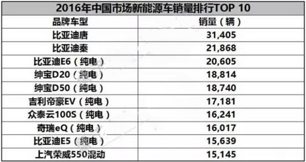 聊完美國市場,我們再把視線轉移到中國國內市場。從乘聯(lián)會發(fā)布的2016年新能源汽車銷量數(shù)據(jù)來看(進口車型沒有計入其中),比亞迪包攬前三甲,銷量均在2萬輛以上,比亞迪唐更是突破了3萬輛的門檻。