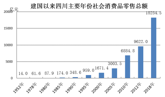 2019年是新中國成立70周年。在黨的堅強領導下,四川深化流通領域改革,扎實推進供給側結構性改革,消費市場繁榮發展,市場規模逐步擴大,消費熱點不斷涌現,消費新動能快速成長,消費模式日新月異,居民收入與經濟同步增長,已形成多種經濟成分、多種經營類型、多種經營業態并存的市場網絡和流通新格局,消費對經濟發展的基礎性作用日益增強,取得了令人矚目的成就。